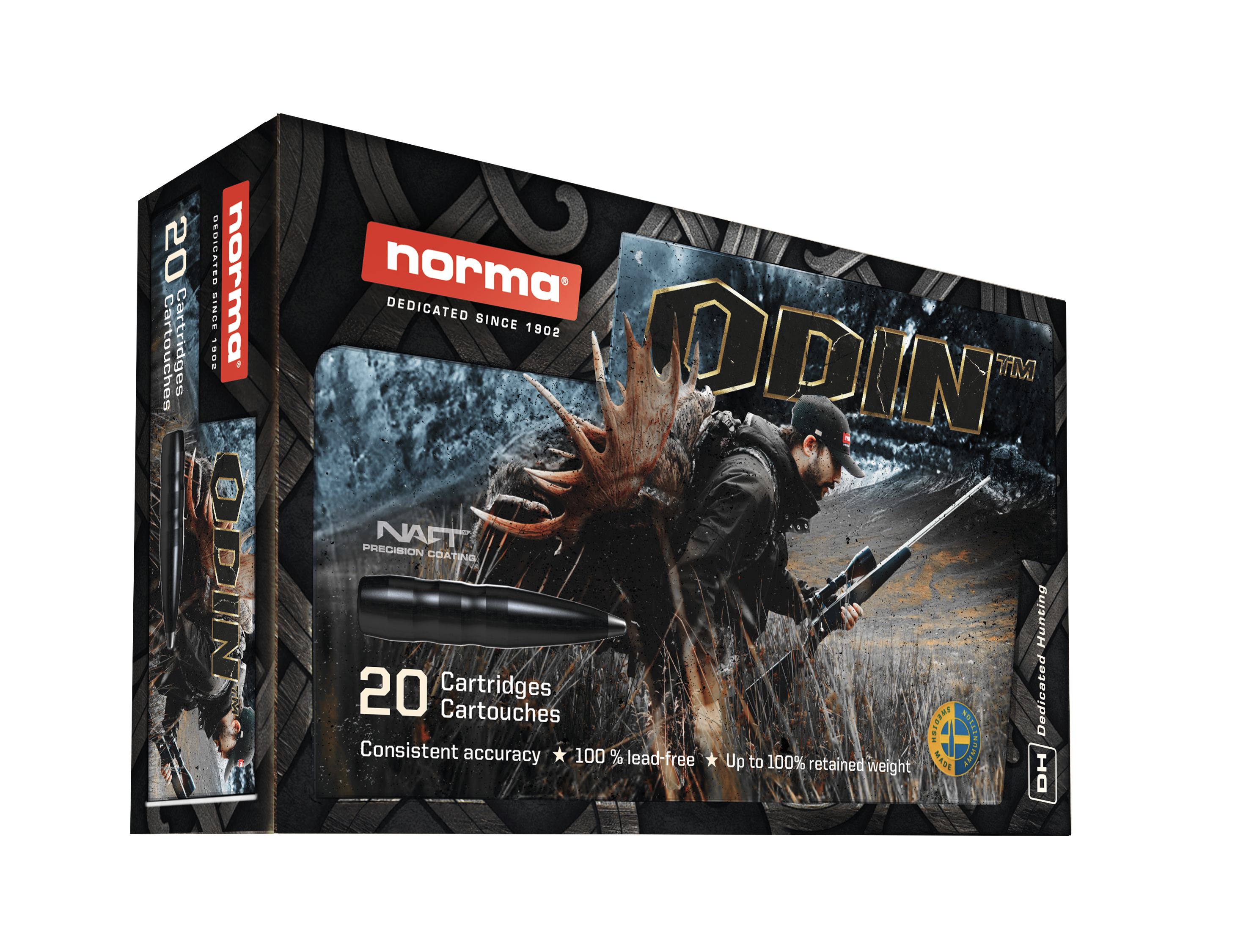 Das aerodynamische Design mit Boat-Tail und Polymerspitze sorgt für eine exzellente Außenballistik, während die neu designte Expansionskavität eine schnelle, kontrollierte Deformation und ein nahezu vollständiges Geschoss-Restgewicht garantiert. Die NAFT-Technologie reduziert die Laufreibung, den Verschleiß und trägt zu einer längeren Lauflebensdauer bei. So verbindet ODIN modernste Ingenieurskunst und bietet den Jägern ein Jagdgeschoss mit der kompromisslosen NORMA-Qualität.